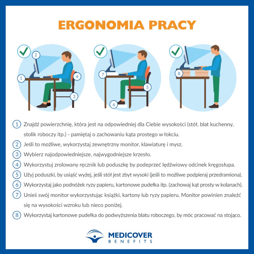 Pierwszym istotnym elementem jest przygotowanie miejsca pracy. Warto zwrócić uwagę na fakt, że część pracowników nie ma w domu biurek, pracuje przy stole lub trzyma laptop na kolanach, siedząc na fotelu. O ile w sporadycznie zdarzającej się pracy zdalnej, nie jest to dużym problemem, o tyle funkcjonowanie w taki sposób przez wiele miesięcy może doprowadzić do problemów zdrowotnych. Część firm decyduje się na wyposażenie lub częściowe doposażenie stanowisk pracy w domu swoich pracowników w celu zadbania o lepszą ergonomię pracy przy komputerze.